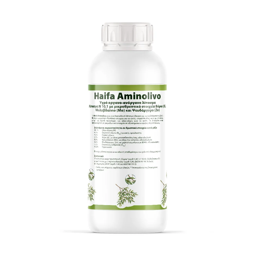Το Haifa Αmino Οlivo είναι ένα υγρό οργανο-ανόργανο διαφυλλικό λίπασμα αζώτου (Ν) 10,1 με μικροθρεπτικά στοιχεία βορίου (B), μολυβδαινίου (Mo) και ψευδαργύρου (Zn), ιδανικό για την καλλιέργεια της ελιάς. Περιέχει τα απαραίτητα θρεπτικά στοιχεία για τα φυτά, ισορροπημένα και στην καλύτερη μορφή για άμεση πρόσληψη και αξιοποίηση από τα φυτά. Το Haifa Αmno Οlivo είναι εμπλουτισμένο με μικροθεπτικά στοιχεία σε αξιοσημείωτα υψηλές συγκεντρώσεις.